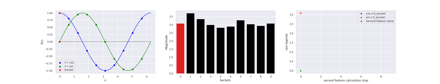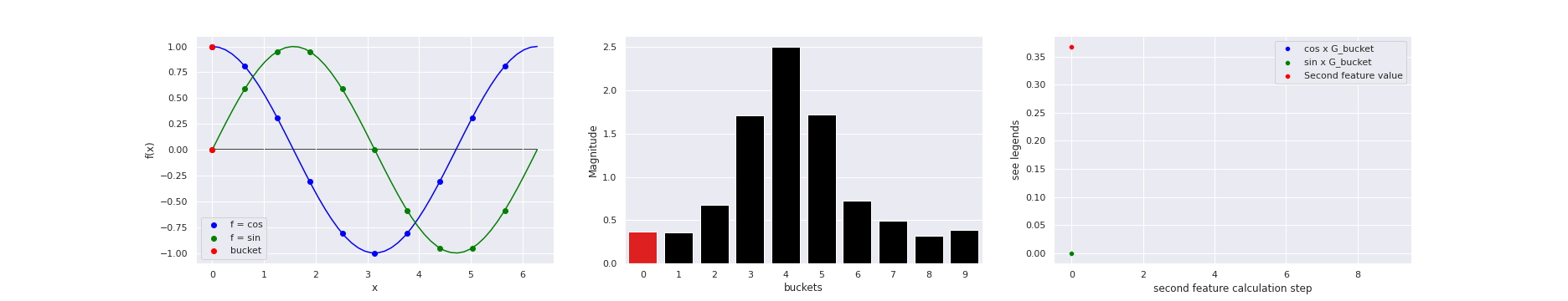 To distinguish this, we will take the cosine and sine for angle values between 0 and \(2\pi \), divided by the number of buckets. We will obtain our second feature with the following formula: