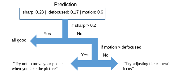 During the inspection, this library will provide images to the model and will display appropriate messages for each scenario, such as: "Try not to move your phone when you take the picture" if it is one with motion blur.