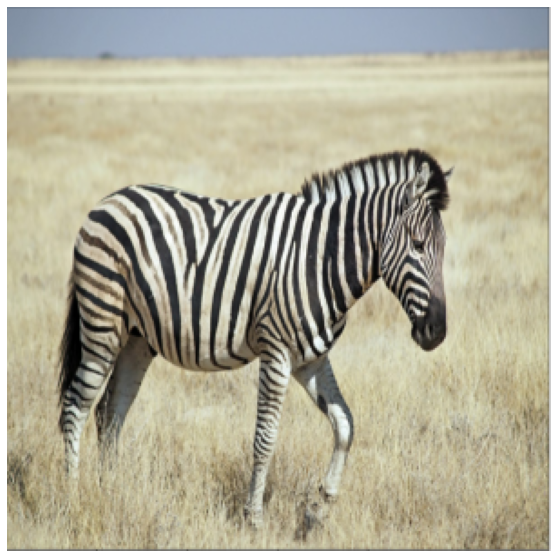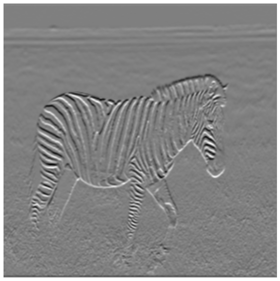 Here is an example of a convolution operation between an image representing a zebra and the kernel to obtain the partial derivatives along the y axis (the height of the image). On the picture, we can clearly see that the horizontal stripes of the zebra are highlighted compared to the vertical stripes.