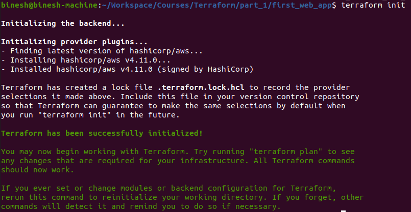 After adding all the configuration in main.tf we will initialize terraform by executing the command terraform init. This initialises and download the aws provider plugin and creates the lock file too.