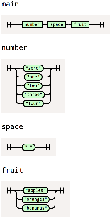 main -> number space fruit {% ([count, _, type]) => ({count, type}) %}