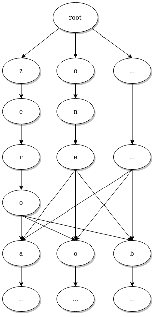 Once the output of the deep learning model has been computed, the usual beam search algorithm can then be applied. This algorithm looks for the most probable sequence of characters that respects the grammar. To do that, the grammar is first converted to a trie of individual characters, this data structure can be used to list every characters that are allowed after a given starting sequence.