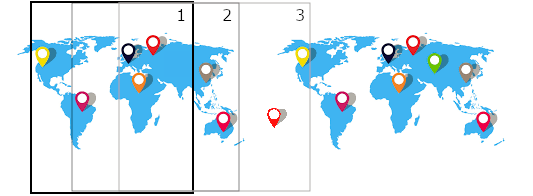In the example below, we have our anchor in San Francisco and our rectangle that only moves east. In our situation we cannot take into account the pines west of our anchor (for example below the red pine). To solve this problem we have chosen to duplicate the map and the pin. With this solution we can find the rectangle "3" which contains the most pine.