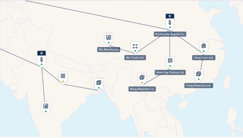 First we wanted to display all suppliers on a map, group them by cluster and link them with lines when they are working together.