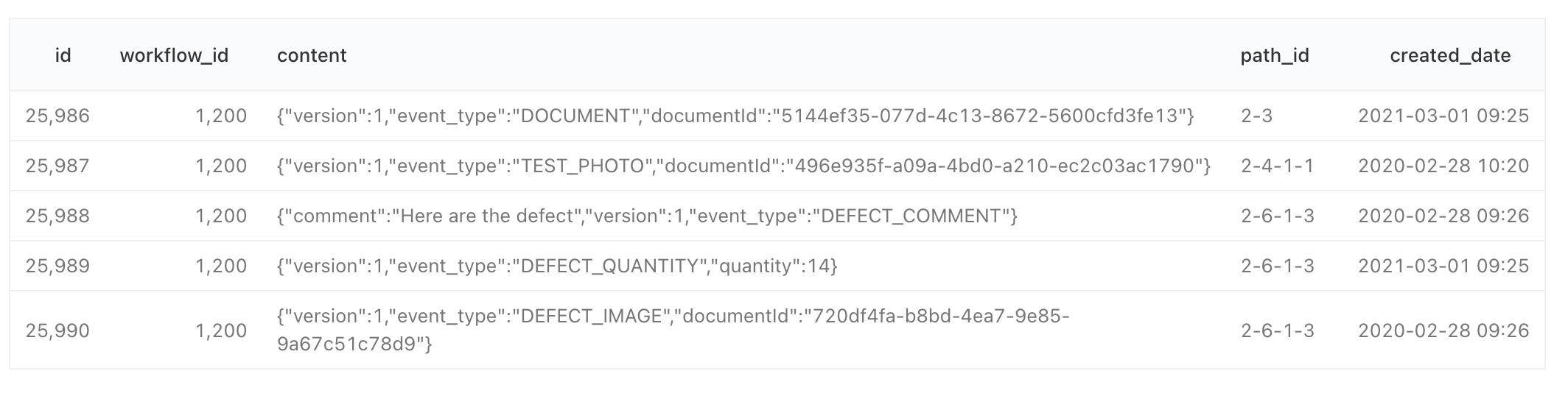 So, we decided to use another approach, more complex but lighter, which consist to store each inspector action as an event. With this approach we just need to save every answer as a single line in our database, and we don't need to load the full workflow json to update it.